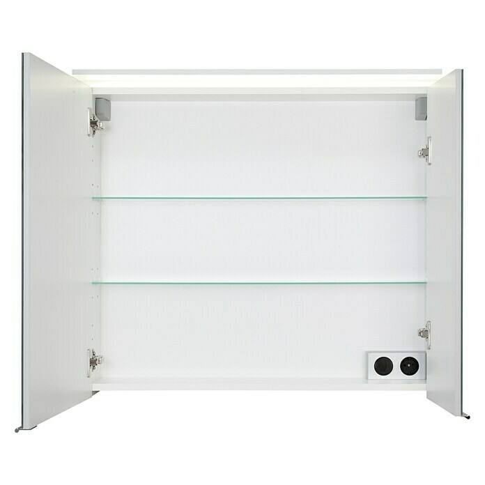 Szafka lustrzana imponuje łatwym montażem, wygodnymi, całkowicie metalowymi zawiasami ze zintegrowanym tłumieniem oraz kombinacją wyłącznika/gniazdo.